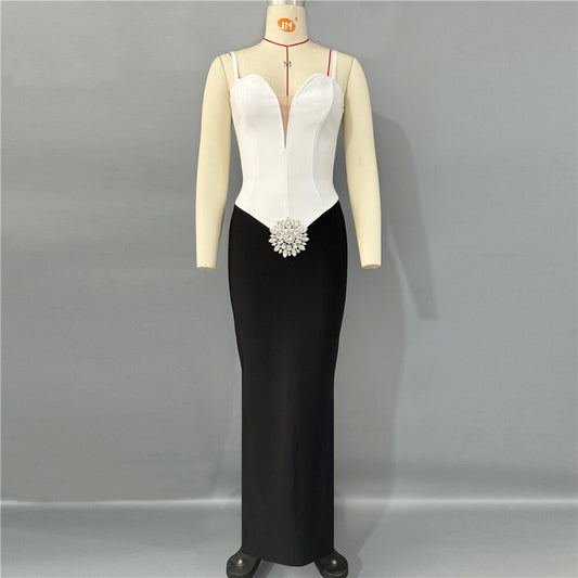 Long Sleeve Bardot Maxi Dress Black White HV2564
