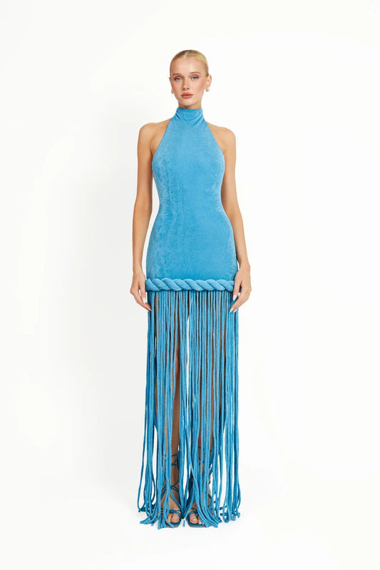 Halter Tassel Maxi Velvet Dress Blue HV2621