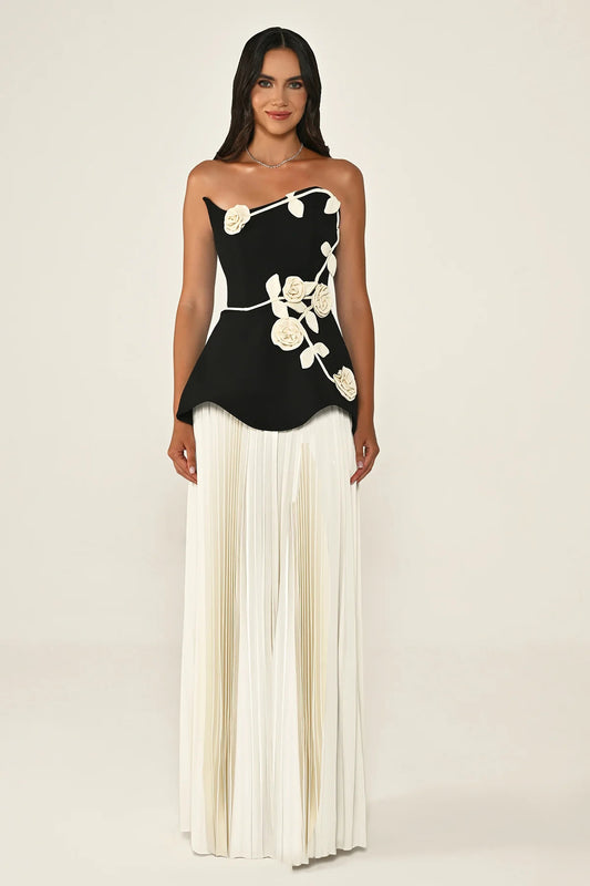 Pleated Bustier Maxi Dress Black White HV1818