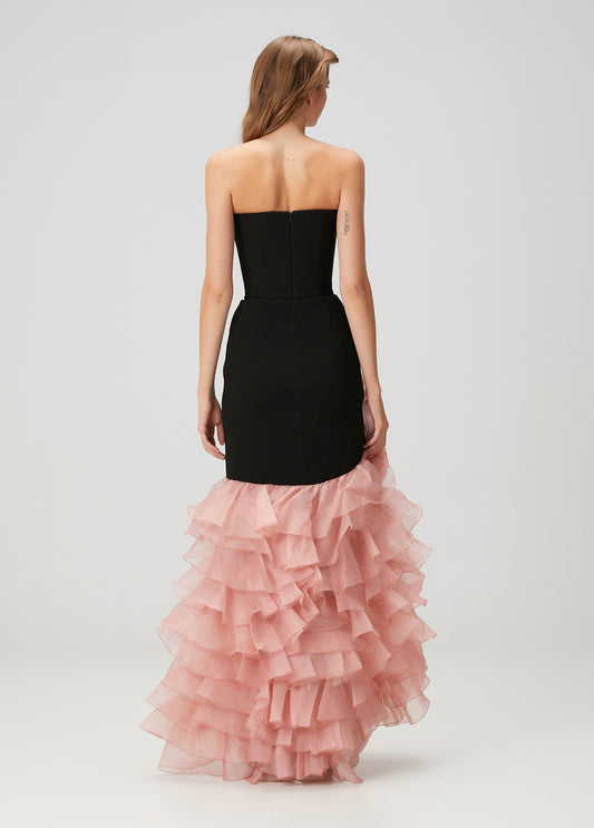 Strapless Floral Ruffle Maxi Dress Black Pink HV2811