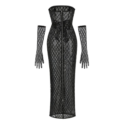Strapless Crystal Sequin Floral Maxi Dress Black White HV2902