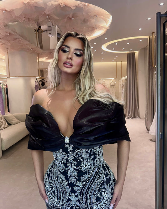 Draped Bardot Sequin Maxi Dress Black HV2052