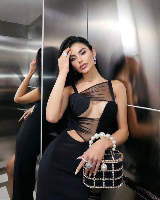 Draped Mesh Long Sleeve Structured Dress HV8650
