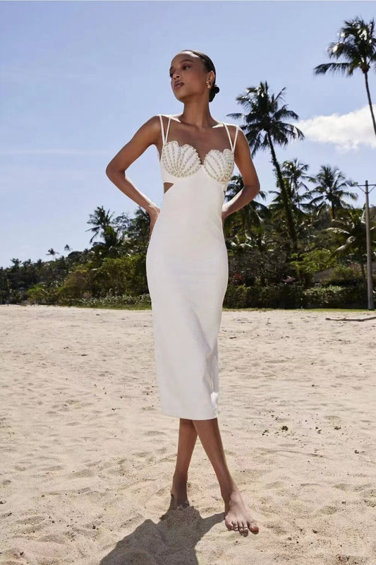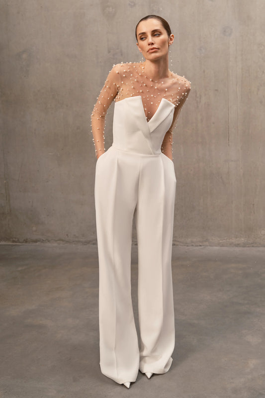 Embellished Long Sleeve Two Piece Jumspuit White Nude HV1229