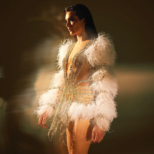 Feather Long Sleeve Crystal Dress Nude HV1694