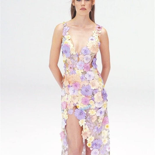 Floral Embroidered Sequin Dress Green Pink HV1600
