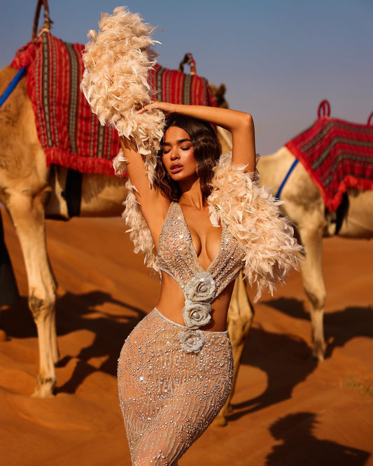 Floral Detail Sequin Maxi Dress Silver Nude HV1628