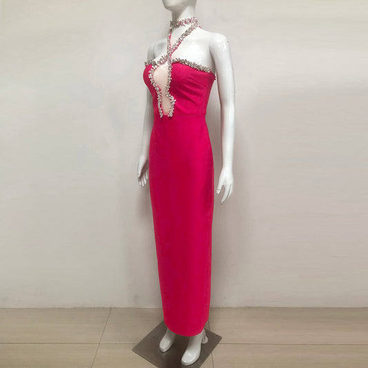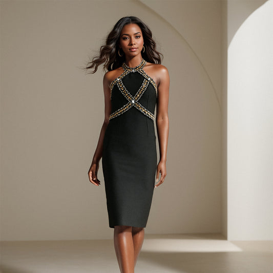 Halter Crystal Braid Maxi Velvet Dress Black HV1897