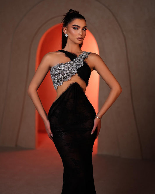 Halter Crystal Bustier Lace Maxi Dress Black HV2019