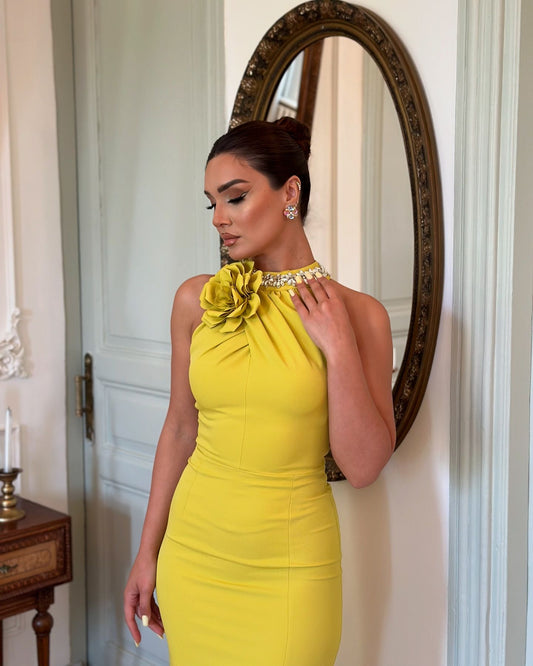 Halter Embellished Draped Midi Dress Neon Green HV8723