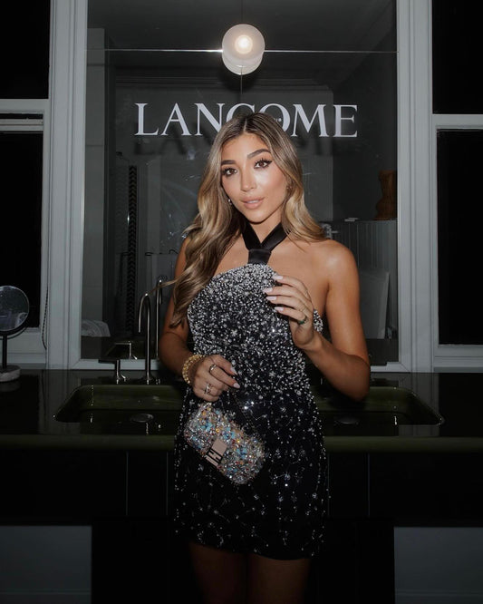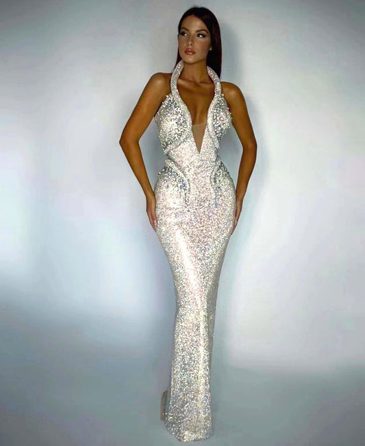 Halter Sequin Crystal Backless Maxi Dress Silver HV2056