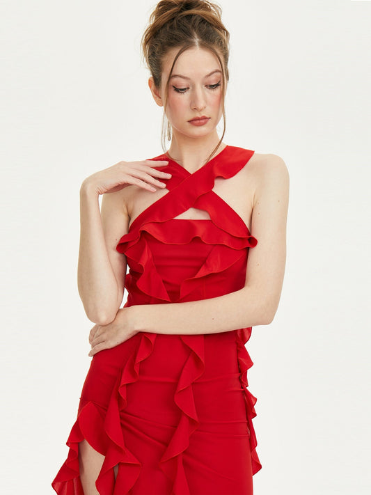 Halter Ruffle Maxi Dress Hot Pink HV9411