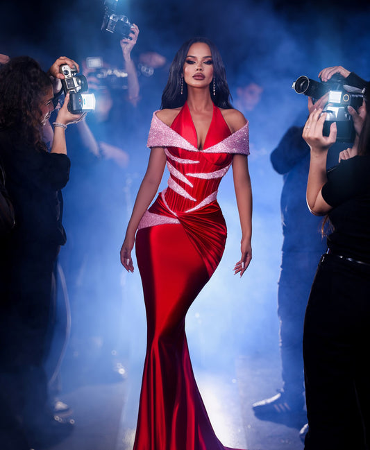 Halter Sequin Corset Maxi Velvet Dress Red HV2020