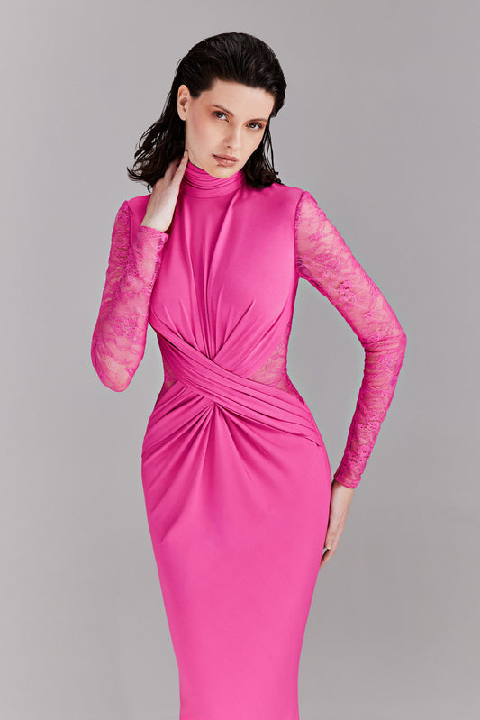 Lace Long Sleeve Draped Maxi Dress Hot Pink HV1768