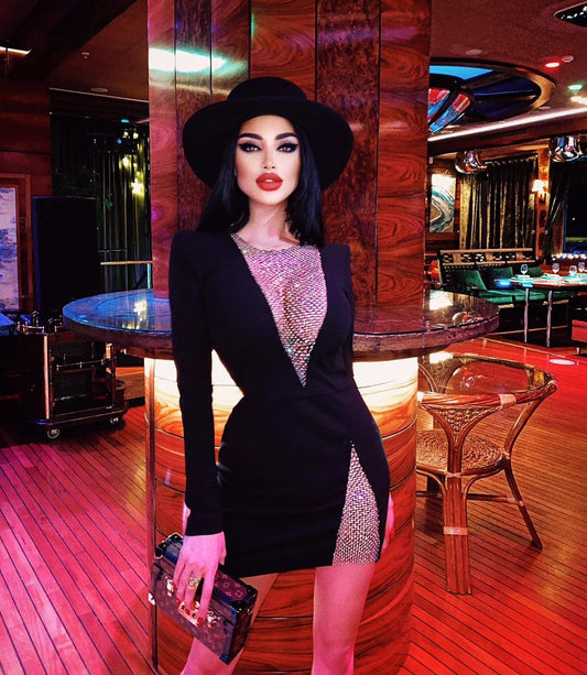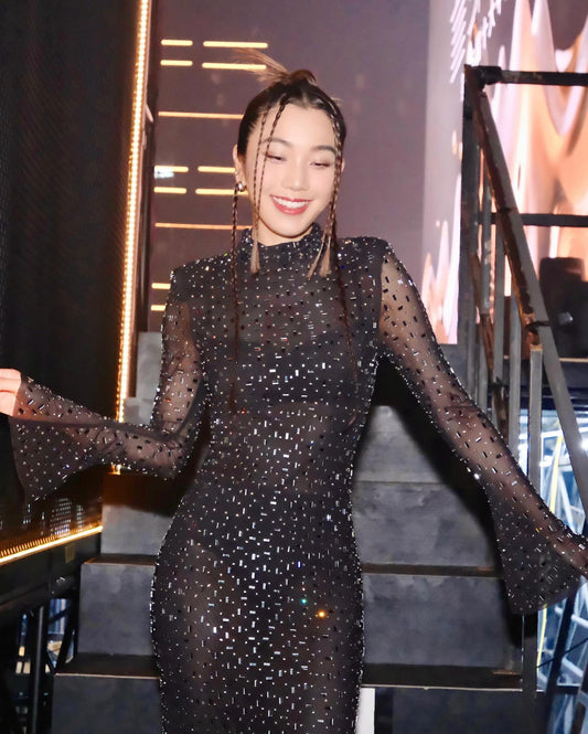 Long Sleeve Embellished Corset Mesh Dress Black HV1613