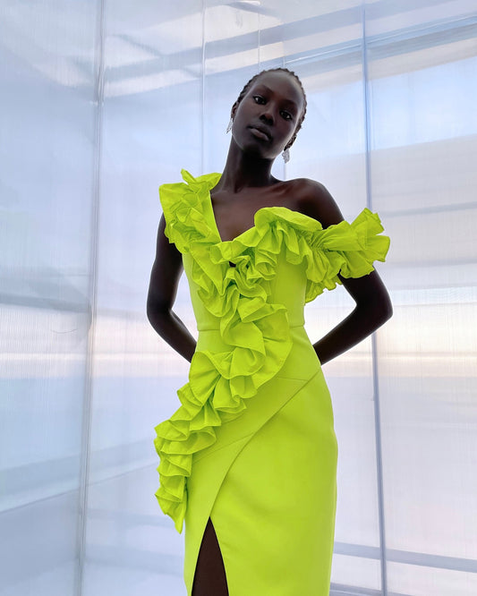 One Shoulder Ruffle Maxi Dress Neon Green HV1511