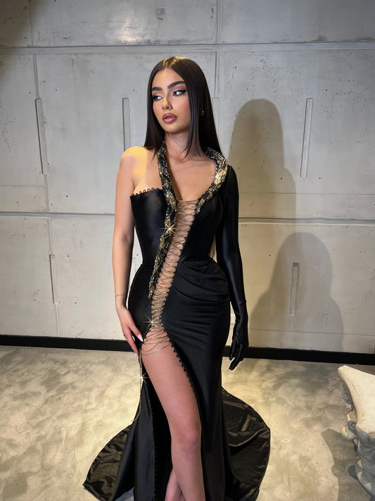 One Sleeve Embellished Mermaid Maxi Dress Black HV1208