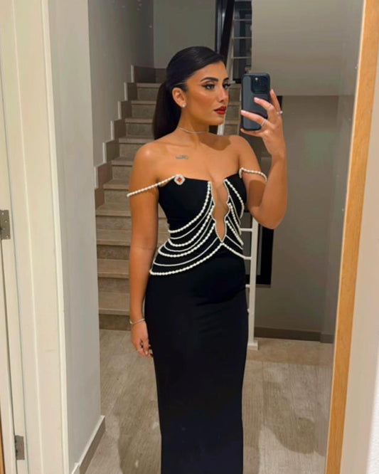 One Sleeve Pearl Flower Midi Dress Black HV9932