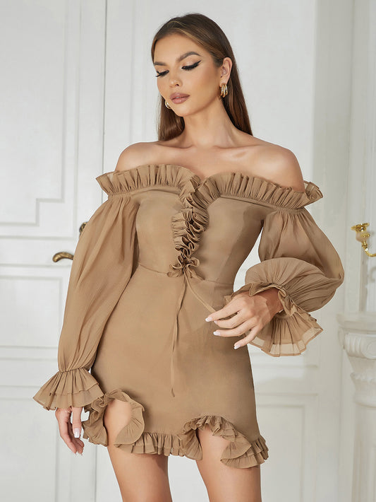 Puff Long Sleeve Off Shoulder Ruffle Dress Brown