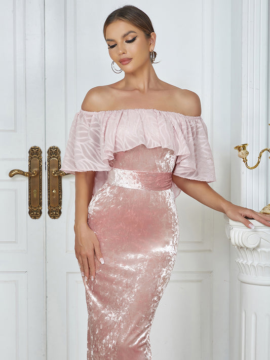 Ruffle Off Shoulder Maxi Velvet Dress Pink HV9754