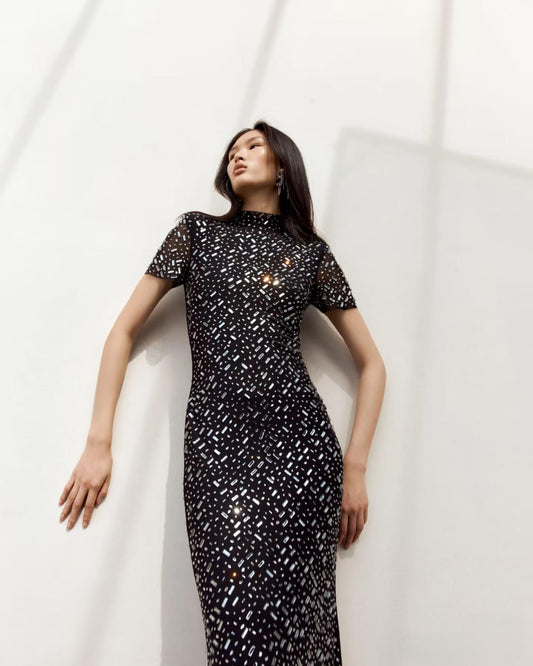 Short Sleeve Crystal Mesh Maxi Dress Black HV2209