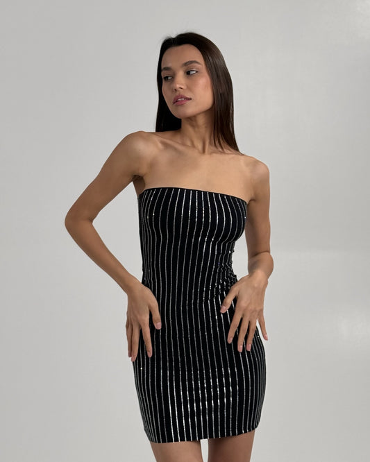 Strapless Crystal Ruffle Dress Black Nude HV1702