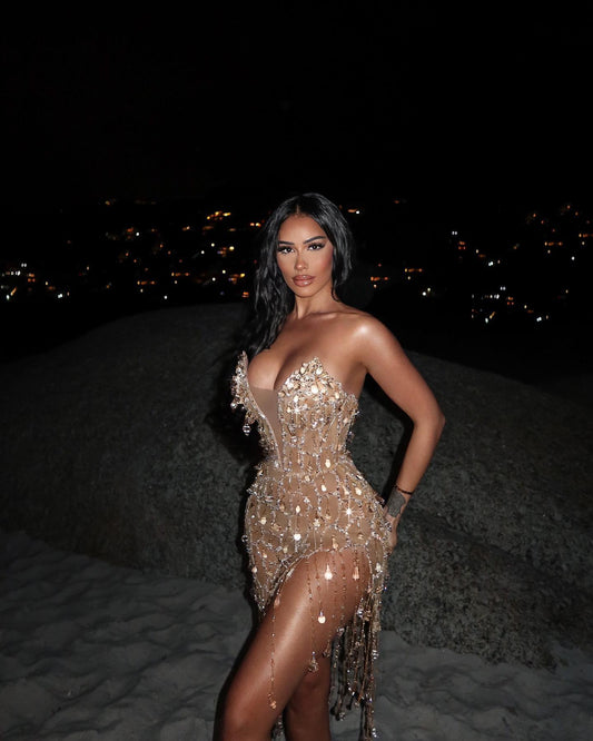 Strapless Crystal Sequin Corset Maxi Dress Nude HV1916