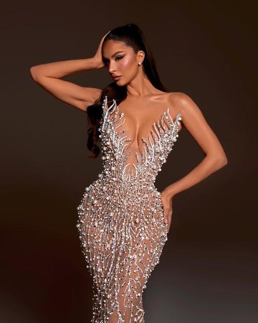 Strapless Crystal Sequin Mermaid Maxi Dress HV1508