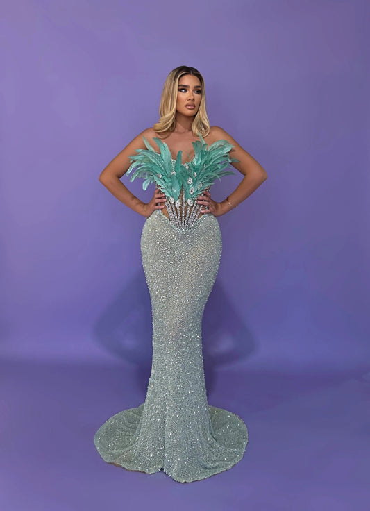 Strapless Feather Corset Sequin Maxi Dress Green HV1967