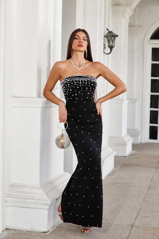 Strapless Crystal Pearl Maxi Velvet Dress Black HV1765