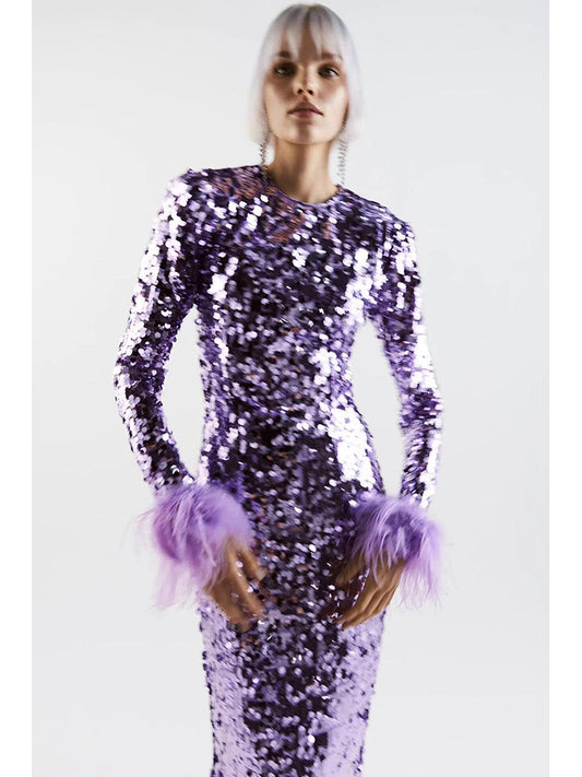 Long Sleeve Feather Sequin Midi Dress HV8915