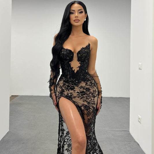 Strapless Sequin Lace Maxi Dress Black HV1630