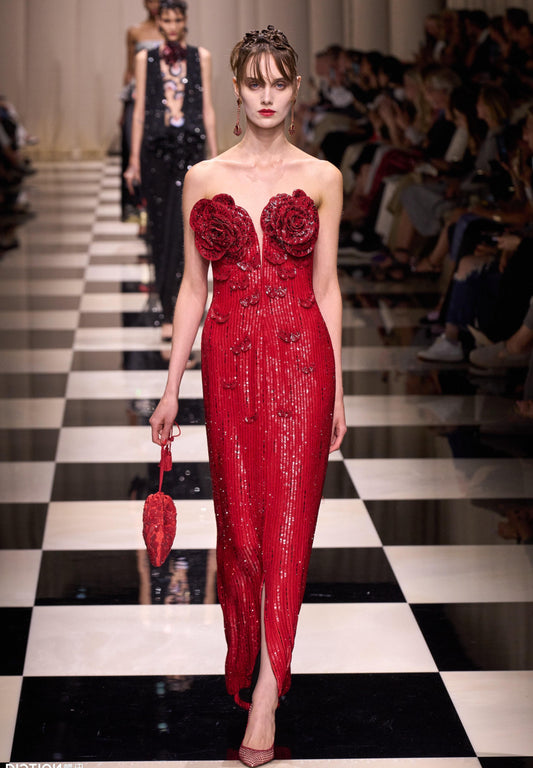Strapless Flower Sequin Maxi Dress Red HV1007