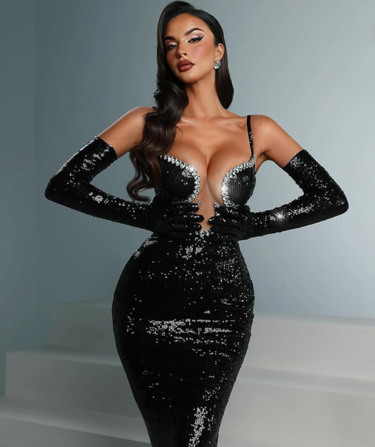 Crystal Bustier Sequin Maxi Dress Black HV1224
