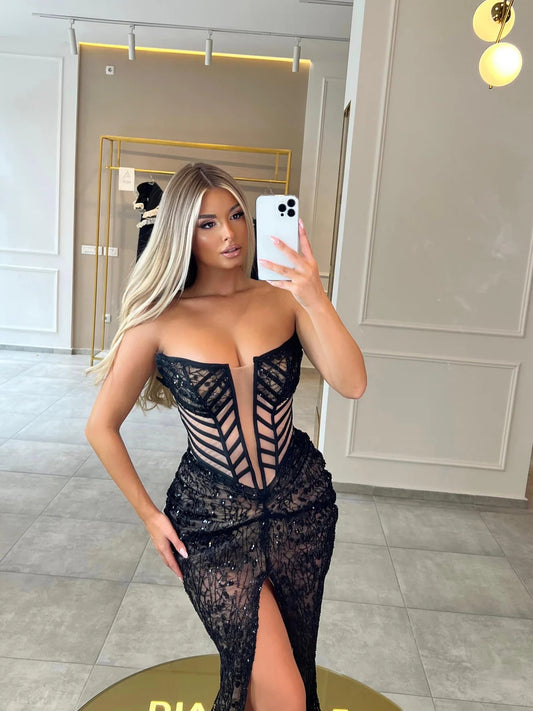 Strapless Sequin Lace Mermaid Dress Black HV1316