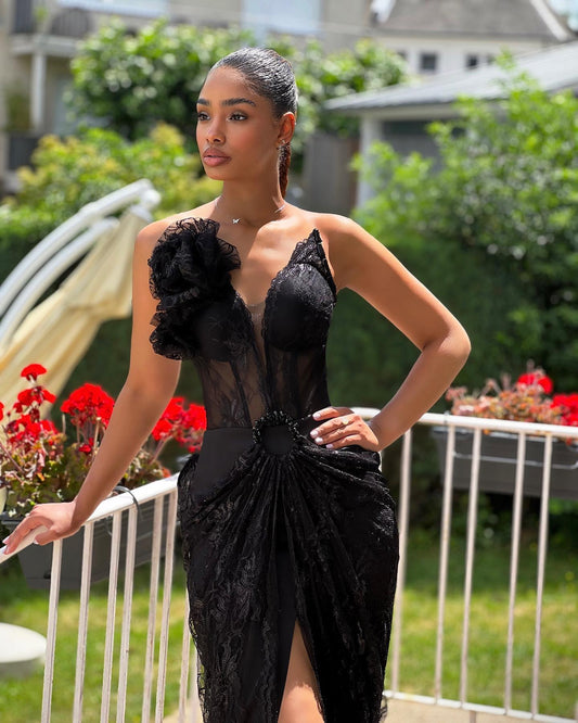 Strapless Floral Draped Lace Maxi Dress Black HV1140