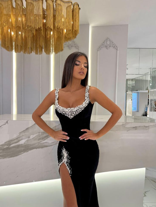 Crystal One Shoulder Mermaid Maxi Velvet Dress Black HV1166