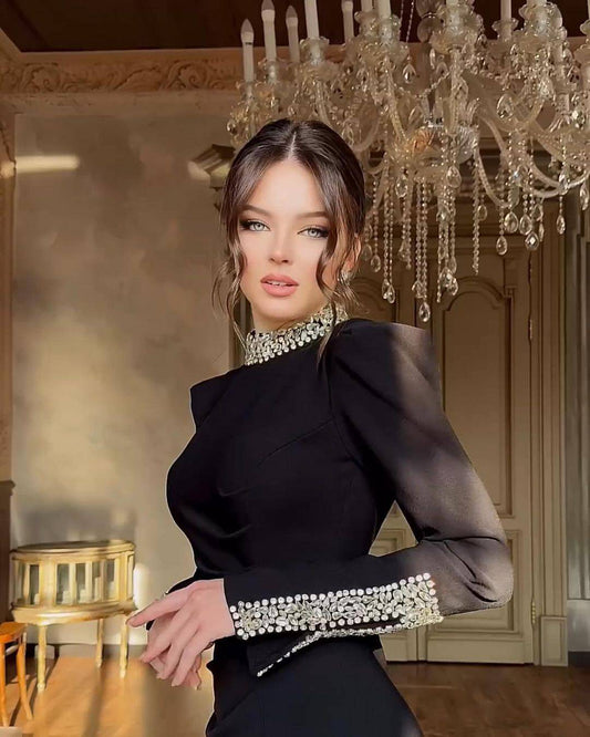 Long Sleeve Crystal Detail Midi Dress Black HV1687