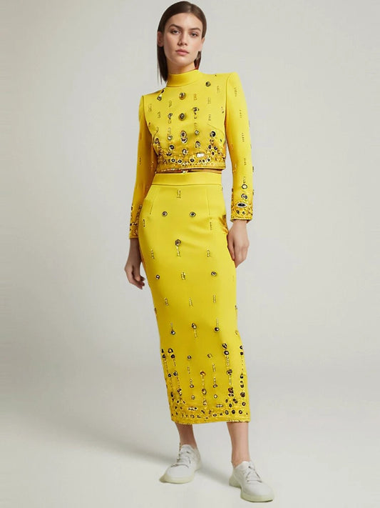 Long Sleeve Crystal Midi Two Piece Dress Yellow HV1185