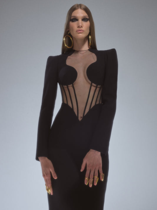 Long Sleeve Bustier Mesh Maxi Dress Black HV1537
