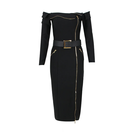 Long Sleeve Off Shoulder Belt Midi Dress Black HV9903