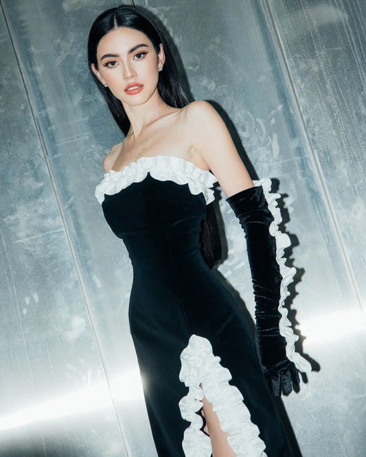 Strapless Ruffle Detail Maxi Velvet Dress Black White HV1399