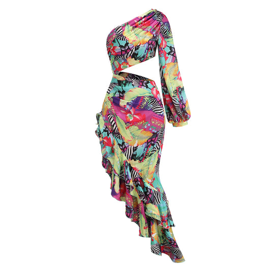 One Sleeve Floral Ruffle Maxi Dress Hot Pink Lime HV1389