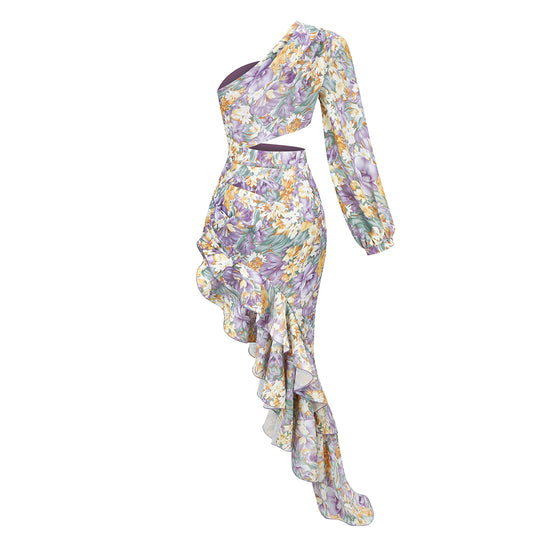 One Sleeve Floral Ruffle Maxi Dress Lavender HV8641