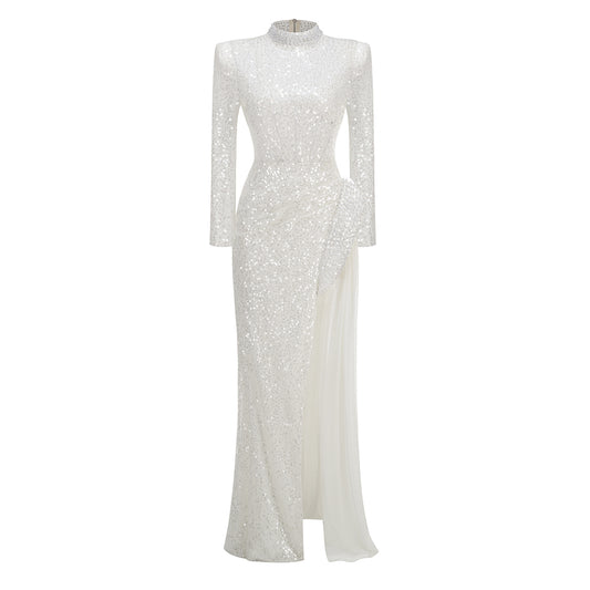 Long Sleeve Sequin Pearl Backless Maxi Dress White