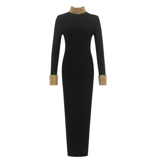 Long Sleeve Embellished Backless Maxi Dress Black HV1739