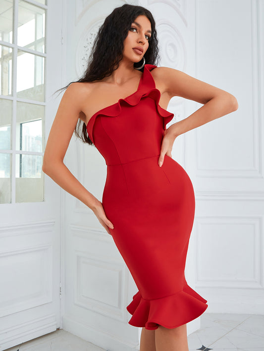 One Shoulder Ruffle Fluted Midi Dress V8749