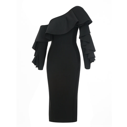 Ruffle Long Sleeve Off Shoulder Midi Dress Black