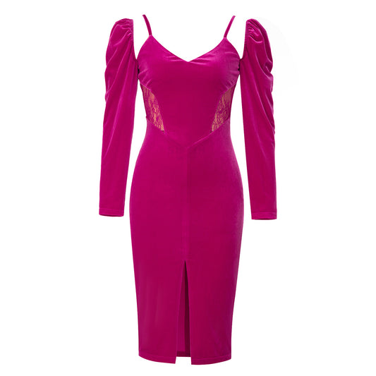 Long Sleeve Lace Insert Midi Velvet Dress Hot Pink