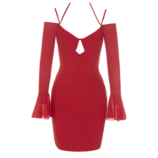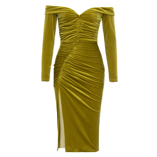 Long Sleeve Off Shoulder Draped Midi Velvet Dress